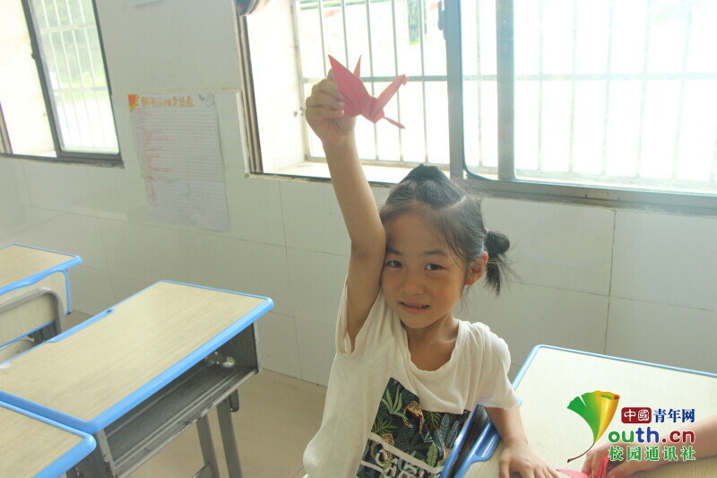 图为孩子开心的举起手向摄影师展示其独立完成的千纸鹤。中国青年网通讯员 邹诗琪 摄