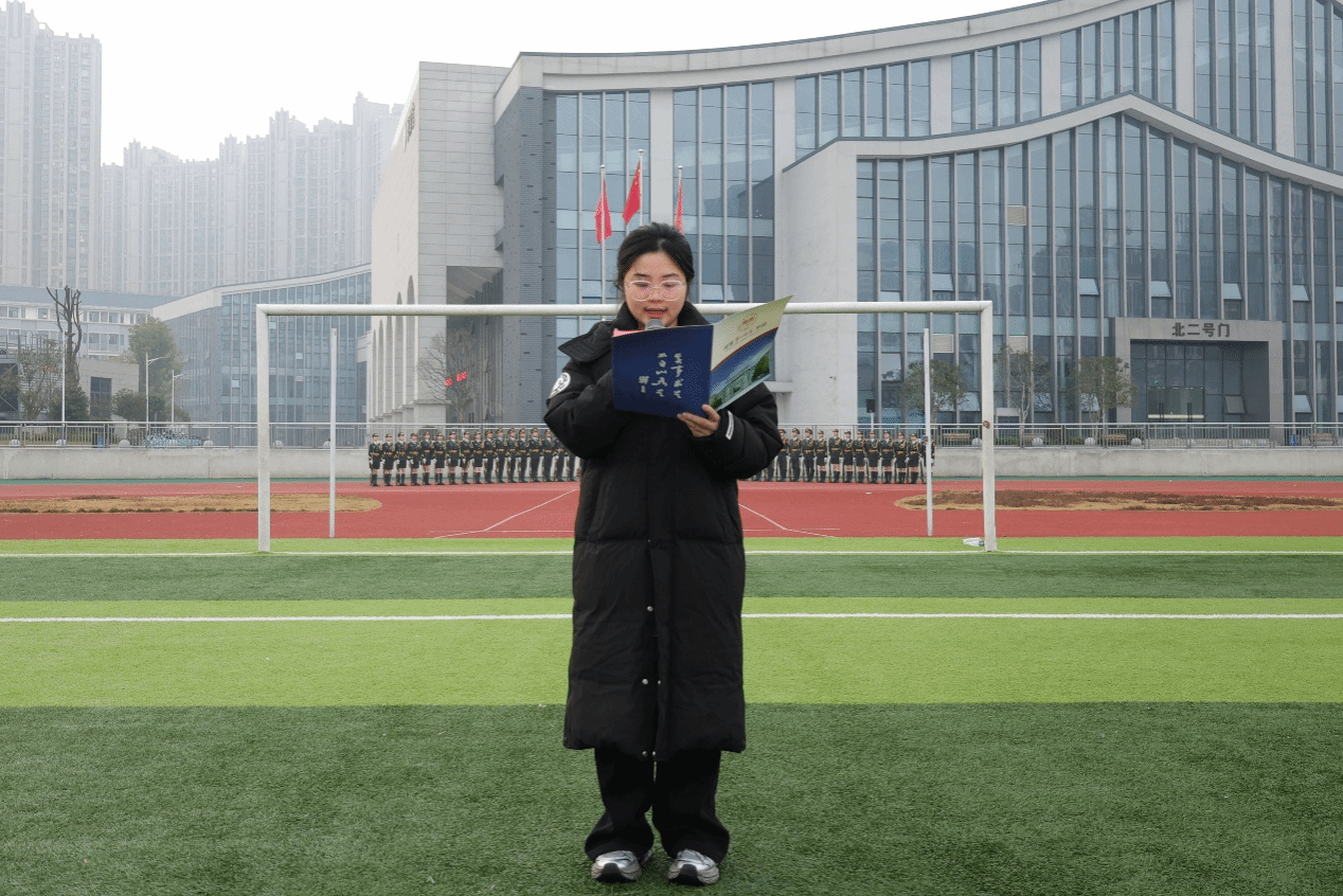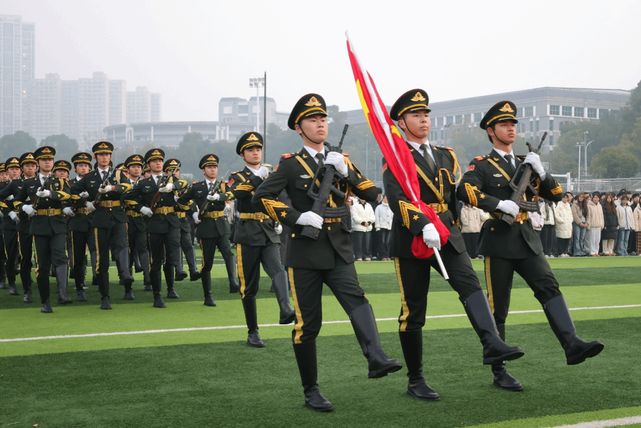 晨光初现,田径场上一片肃穆。国旗护卫队身着统一制服,迈着铿锵有力的步伐,昂首挺胸护卫国旗入场。伴随着雄壮的《义勇军进行曲》,鲜艳的五星红旗冉冉升起,全体师生肃立注目,齐声高唱国歌,表达对祖国的无限热爱与崇高敬意,现场气氛庄重而热烈。